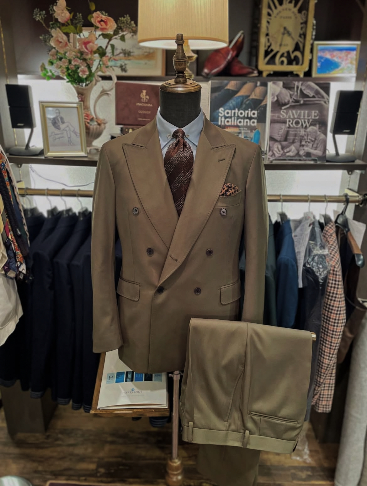 落ち着きのあるブラウンカーキの色味は、クラシックなダブルブレストとの相性も抜群。