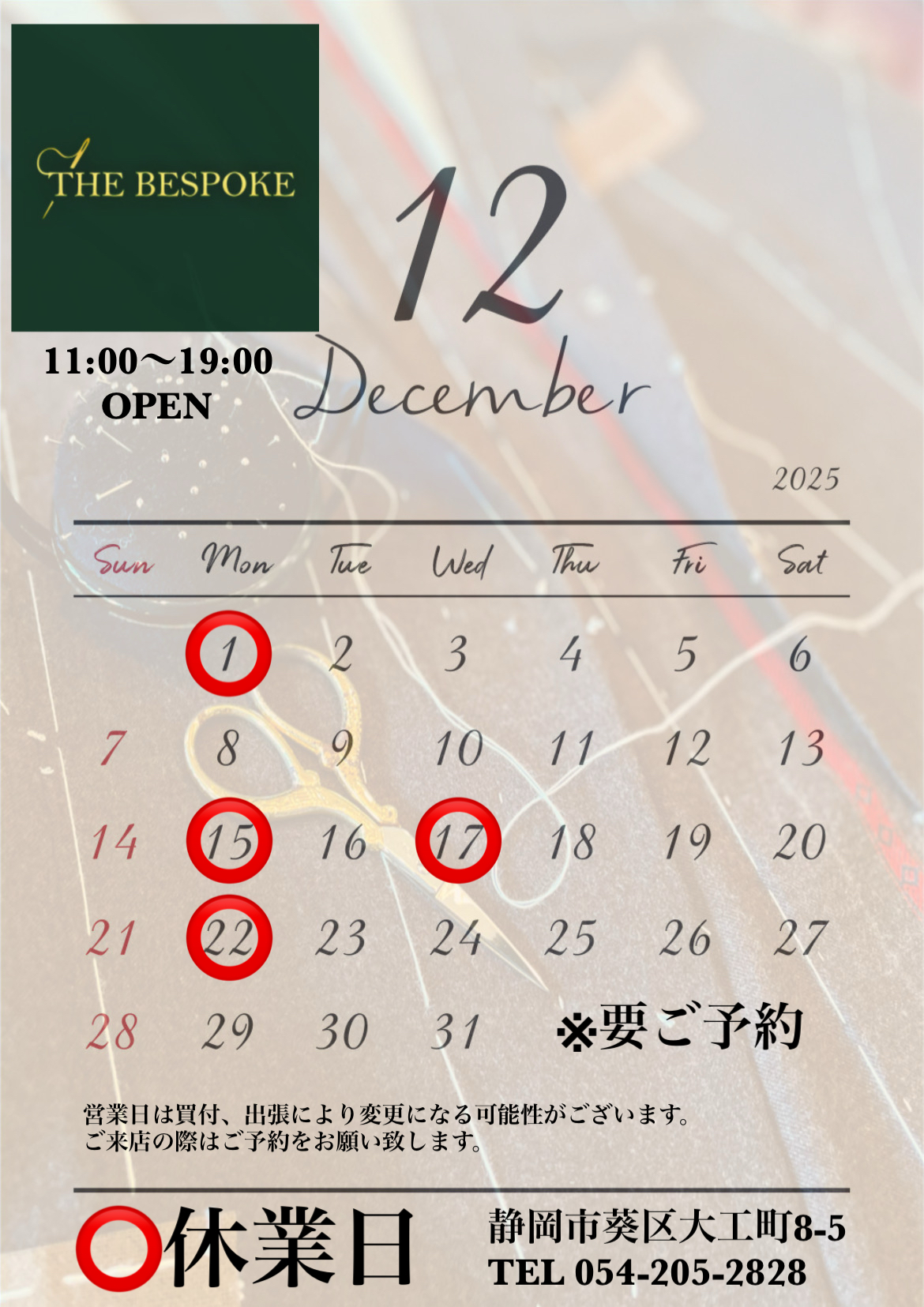 12月 営業カレンダー 2025/11/30 THE BESPOKE 【12月 営業カレンダー】 ※ご予約は随時、お電話、ホームページ、インスタグラム、Facebookにて受け付けております。 お問い合わせ等、お気軽にご連絡下さいませ。 皆様のご来店心よりお待ちしております。
